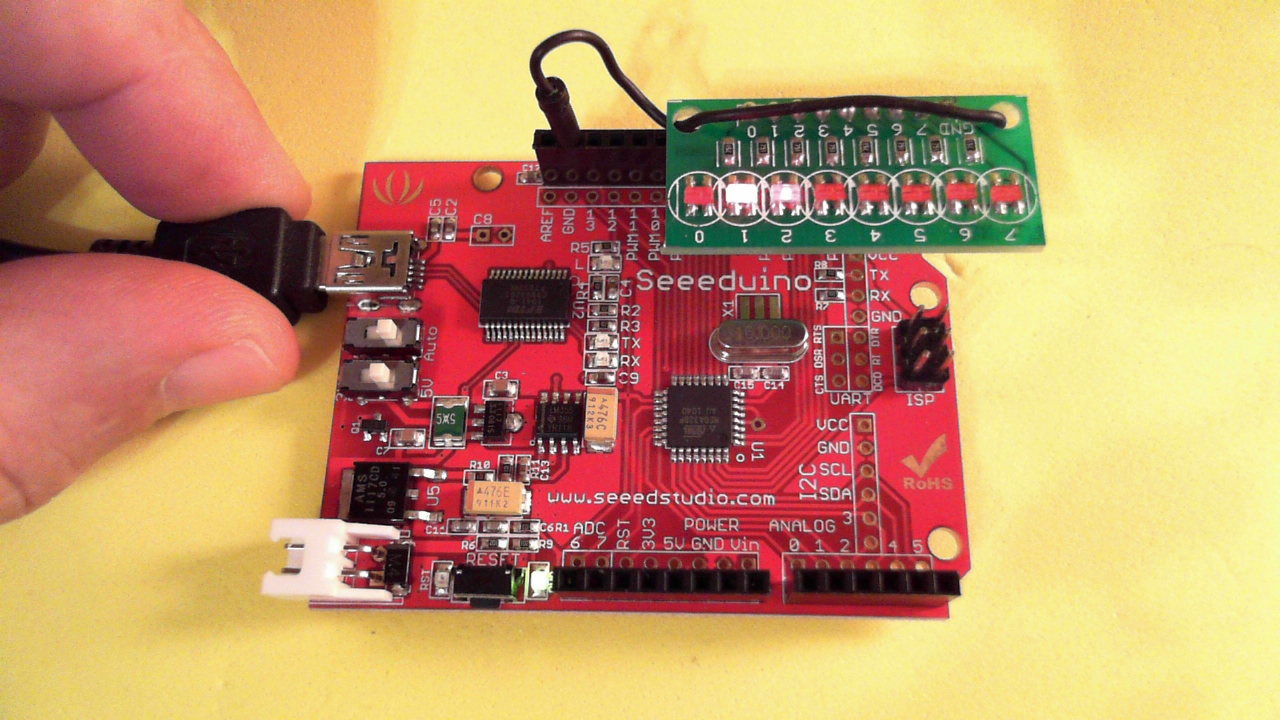 /* KnightR8L.pde Arduining.com 1 MAY 2011 Driving 8 Leds to emulate the Knight Rider car. Leds connected to the digital pins (0~7). */ byte n=0; //The number to be displayed (8 bits). void setup(){ for(int i=0;i<8;i++){ // Digital pins 0~7 as outputs. pinMode(i,OUTPUT); } } void loop(){ for(n=1;n<128;n = n << 1){ PORTD= n; delay(132); // delay(analogRead(0)/4); } for(n=128;n>1;n = n >> 1){ PORTD= n; delay(132); // delay(analogRead(0)/4); } }